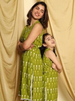 Critter kids Mom-Daughter Twinning Set (Mom XS-5XL, Daughter 1-14 Years) – Green Printed Sleeveless Cotton Dress with Matching Family Ethnic Outfits,