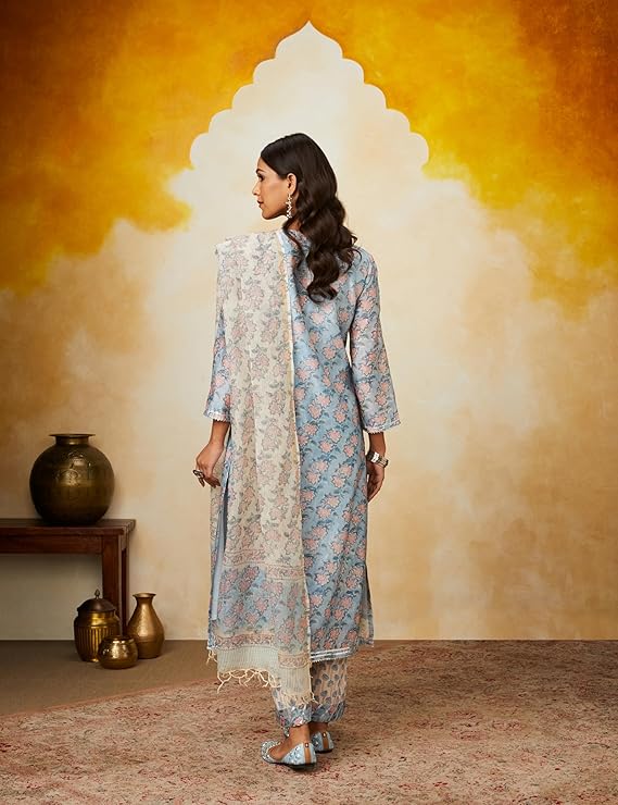 - Kurta : 85% Cotton 15% Silk | Pants: 100% Cotton | Dupatta: 100% Cotton Kota Doria with zari border