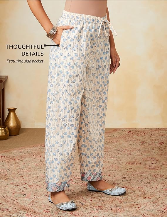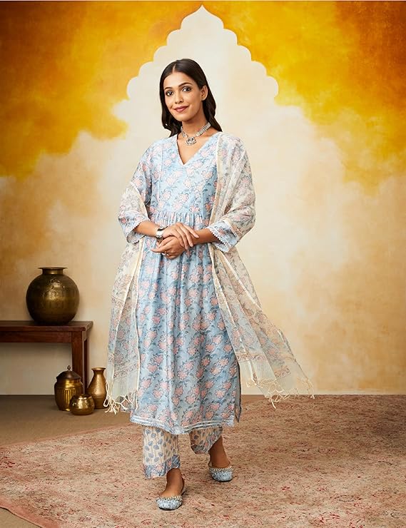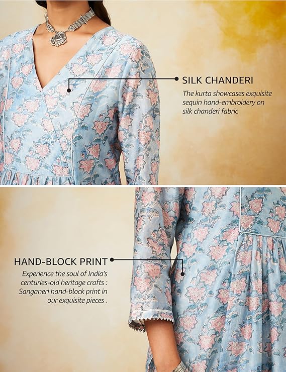 - The authentic Sanganeri hand-block printed set has an A-line kurta with sequin & zari hand-embroidery on the yoke, regular-fit palazzo and a Kota Doria dupatta with zari border.