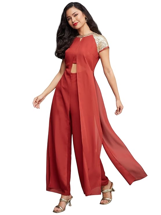 Miss Chase Women’s Round Neck Short Sleeves Sequin Panel Jumpsuit (Plus Size) with Pockets (MCSS21D04-65-149-03, Brick Red, S)
