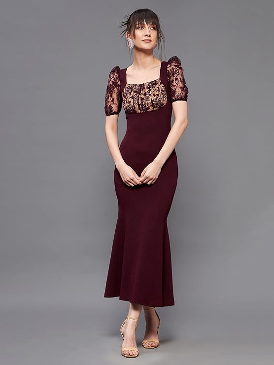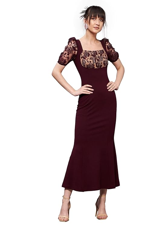Women’s Square Neck Puff Sleeve Solid Lace Overlaid Ankle Length Dress.