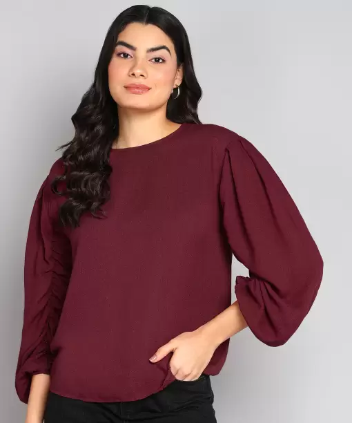 Casual Balloon Sleeve Solid Women Maroon Top.