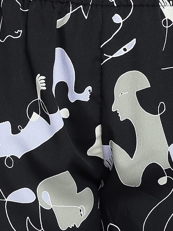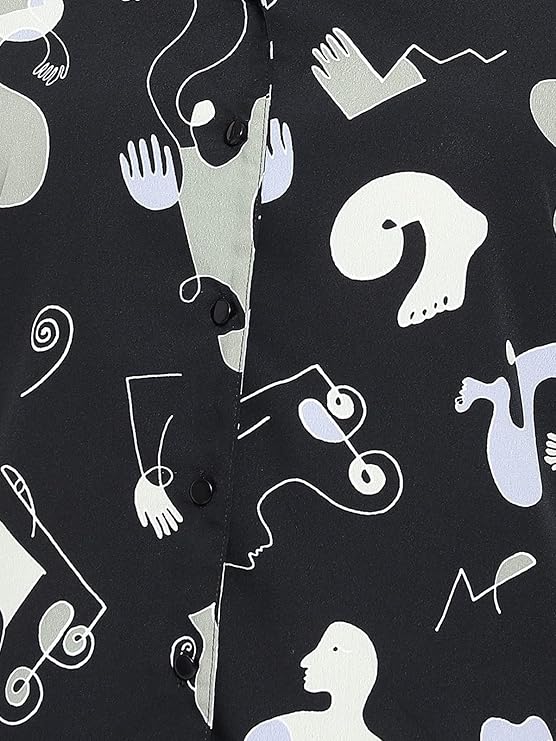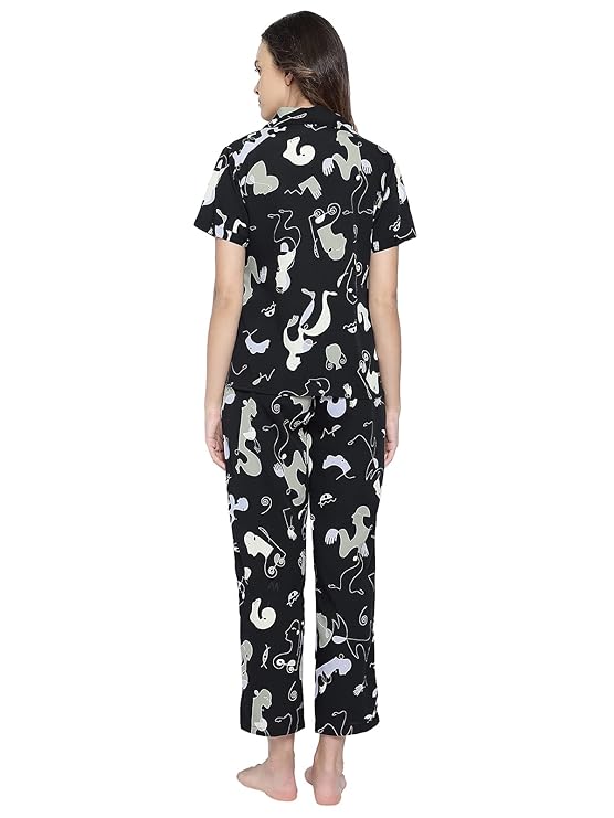 Clovia Women’s Crepe Printed Button Down Shirt & Pajama Set-Black.