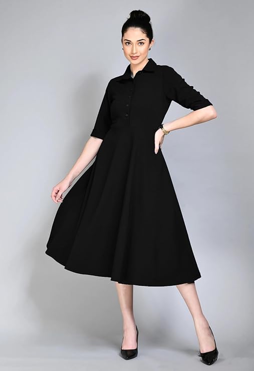 - Button-up front for a classic and elegant look 3/4 sleeves for a chic and cozy style Fit and flared silhouette for a flattering and feminine shape Midi length for a modest and trendy appeal Soft and breathable fabric for comfort and durability