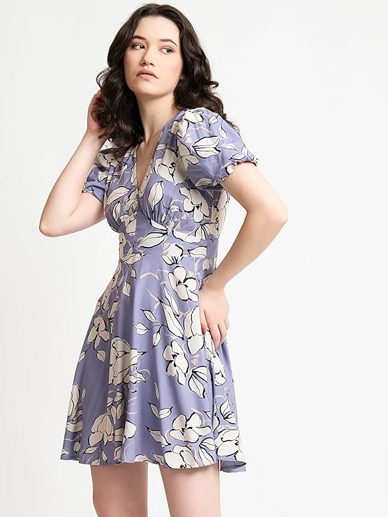Clothing Women s Lavender Rayon Floral Print Fit and Flare Yoke Dress.