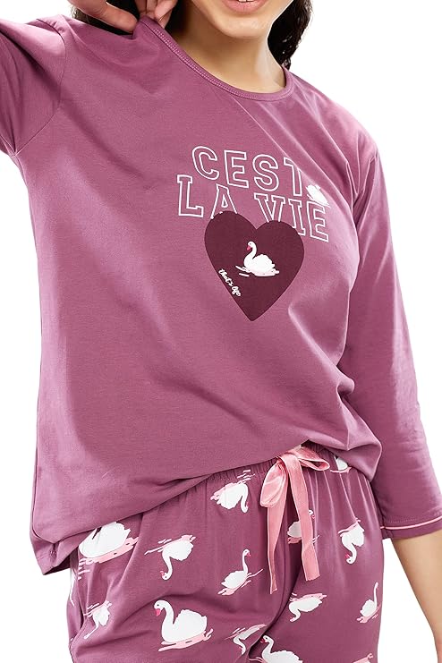 - Material: 100% Pure Cotton | Pattern: Swan printed night suit for women cotton; Two piece Nightwear: Printed Top + Pyjama (Pajama set for women)