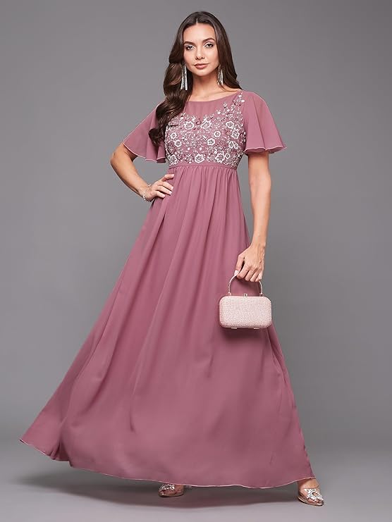 Miss Chase Women’s Boat Neck Half Sleeve Solid Embellished Georgette Maxi Dress