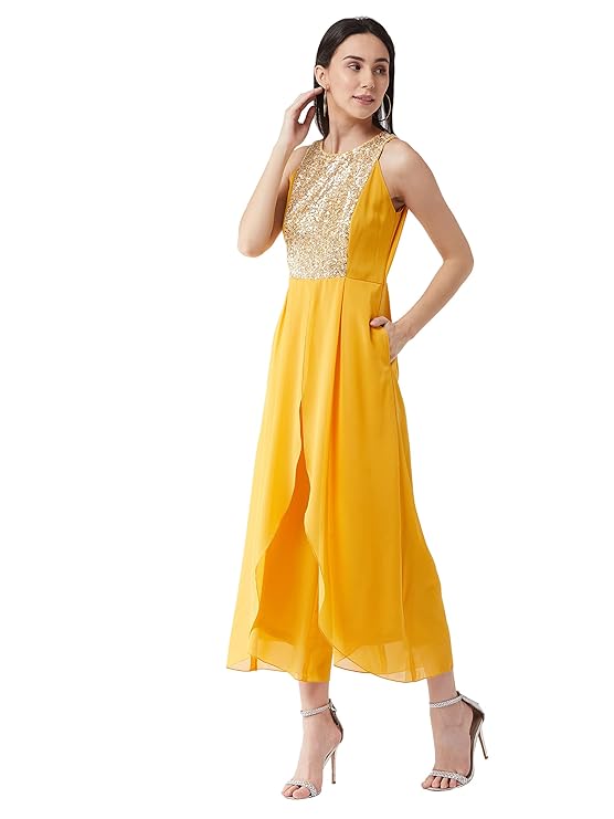 Miss Chase Women’s Mustard Halter Neck Sleeveless Solid Embellished Regular Jumpsuit