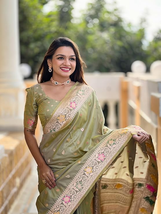 women’s Soft Banarasi Silk Saree with Minakari Weaving & Tassels(BN5_Mahendi)