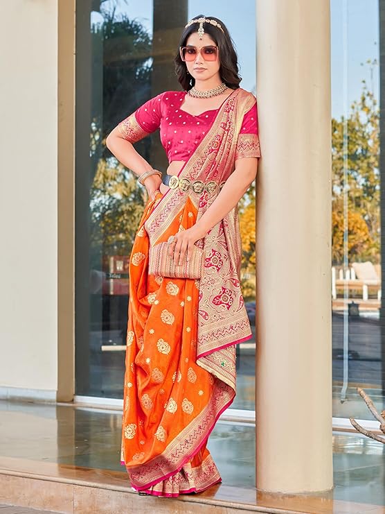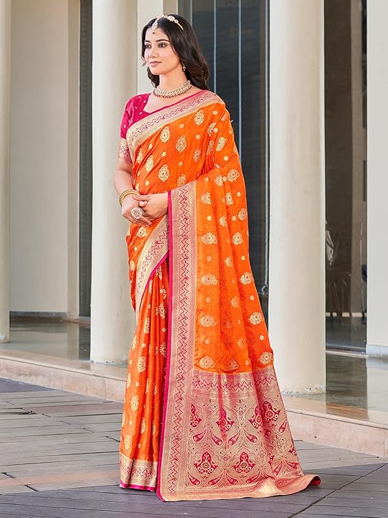 - Saree details- Saree Color: Orange Hand Dyed| Material: Satin Silk | Length: 6.3 m | Pattern: Floral | Work Type: Jacquard Woven Work