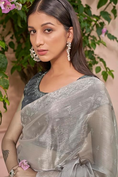 ORHANS Women’s Satin Fix Diamond Work Saree with Solid Printed Lightweight and Art Silk Matching Unstitched Blouse Piece |Saree for College Party