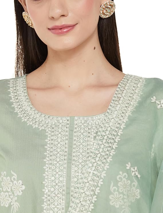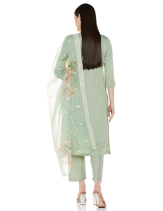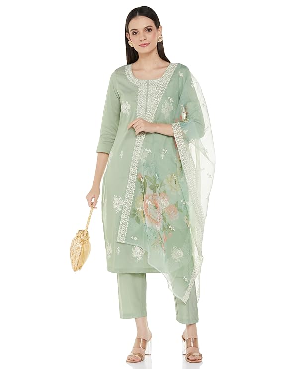 - PRODUCT DETAILS: 3-piece set featuring calf-length regular fit kurta with embroidery at yoke and kurta front, 3/4 sleeves, paired with straight-fit pyjama with pocket and organza dupatta with embroidery.