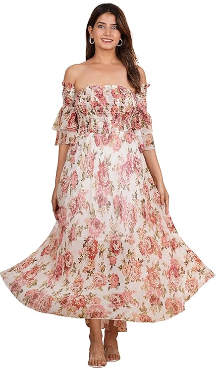 Yash Gallery Women’s Floral Printed Off Shoulder 3/4th Sleeve Maxi Dress