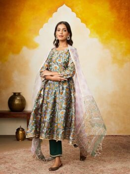 Product details Material composition 85% Cotton 15% Silk Sleeve type 3/4 Sleeve Length Calf Length Neck style Crew Neck Pattern Block print Style Anarkali Country of Origin India About this item The authentic Sanganeri hand-block printed set has an Anarkali kurta with hand-embroidered sequin, zari, moti work on the neck, straight-fit pyjama and Kota doria…