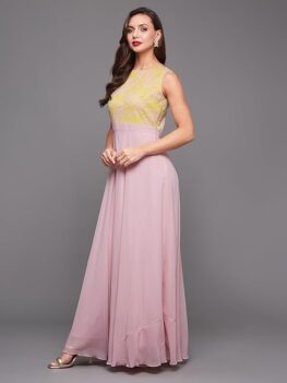 Product details Material type: Georgette Length: Maxi Sleeve type: Sleeveless Pattern: Self Design Style: Lace Overlaid Neck style: Boat Neck Country of Origin: India About this item Fabric: 100% Polyester | Wash Care: Hand Wash with Warm Water, wash dark colors separately, Do not Bleach, Dip Dry away from direct heat, Warm Iron Only Style:…