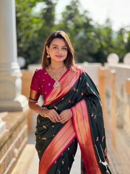 Product details Material composition Paithani silk Weave type Jacquard Occasion type Festival, Party, Wedding Pattern Traditional Prints Care instructions Dry Clean Only Country of Origin India About this item Embrace timeless elegance with this Paithani silk saree, ideal for weddings, festivals, and special occasions. Its classic design and rich textures make it a statement piece…