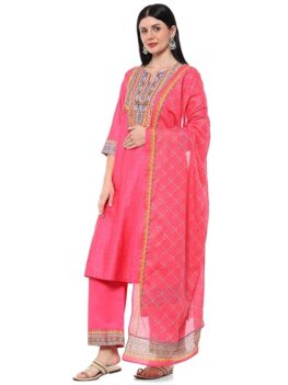 Product details Material composition Cotton Length Calf Length Sleeve type 3/4 Sleeve Neck style Band Neck Style Biba Women Cotton Straight Suit Set Material type Cotton Country of Origin India About this item Color : Pink Fabric : Cotton Sleeve : 3/4th Sleeve Neck : Band Collar Pack Content : Kurta, Palazzo, Potli, Bag Additional…