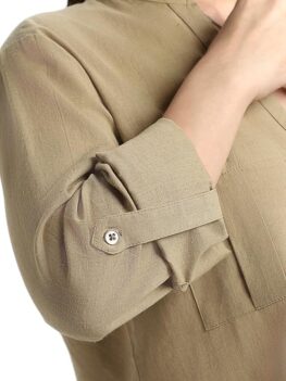 Product details Material composition: Cotton Flex Pattern: Solid Fit type: Regular Fit Sleeve type: Long Sleeve Collar style Mandarin Collar Neck style: Round Neck Country of Origin: India About this item Material Composition: 100% Cotton; Color: Olive Sleeve Type: Long roll up sleeves; Item Length: Regular; Pattern: Solid Style : Stylised Shirt Style Top With…